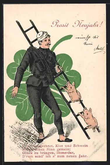 AK Prosit Neujahr, Schornsteinfeger mit Ferkeln und Klee