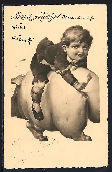 AK Prosit Neujahr!, frecher Kerl packt Schwein am Schwanz