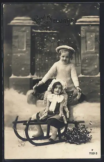 AK Prosit Neujahr, zwei Mädchen mit Schlitten