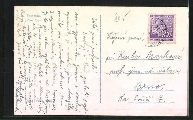 AK Prostejov, Grünanlage mit Denkmal an der Strasse