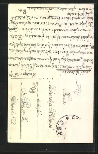 Personenbezogene Daten auf der Rückseite der Karte wurden durch blauen Textmarker unkenntlich gemacht. Die blauen Stellen sind auf die Vorderseite durchgeweicht und wirken sich negativ auf das Postkartenfoto aus