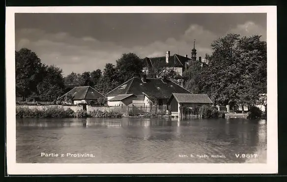 AK Protivin, Häuser am Ufer, Blick zum Schloss