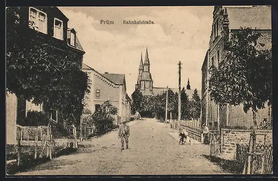 AK Prüm, Mann läuft auf der Bahnhofstrasse mit Kirche