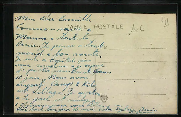 Personenbezogene Daten auf der Rückseite der Karte wurden durch blauen Textmarker unkenntlich gemacht. Die blauen Stellen sind auf die Vorderseite durchgeweicht und wirken sich negativ auf das Postkartenfoto aus