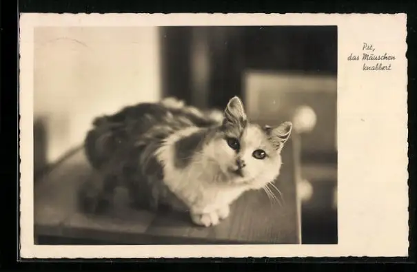 AK Pst, das Mäuschen knabbert, Katze auf einem Tisch