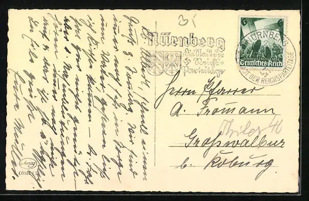 Personenbezogene Daten auf der Rückseite der Karte wurden durch blauen Textmarker unkenntlich gemacht. Die blauen Stellen sind auf die Vorderseite durchgeweicht und wirken sich negativ auf das Postkartenfoto aus