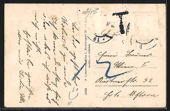 Personenbezogene Daten auf der Rückseite der Karte wurden durch blauen Textmarker unkenntlich gemacht. Die blauen Stellen sind auf die Vorderseite durchgeweicht und wirken sich negativ auf das Postkartenfoto aus