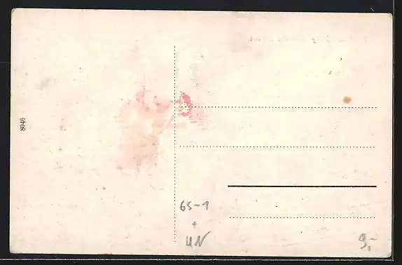 Personenbezogene Daten auf der Rückseite der Karte wurden durch blauen Textmarker unkenntlich gemacht. Die blauen Stellen sind auf die Vorderseite durchgeweicht und wirken sich negativ auf das Postkartenfoto aus