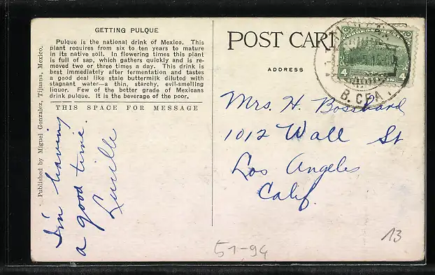 Personenbezogene Daten auf der Rückseite der Karte wurden durch blauen Textmarker unkenntlich gemacht. Die blauen Stellen sind auf die Vorderseite durchgeweicht und wirken sich negativ auf das Postkartenfoto aus
