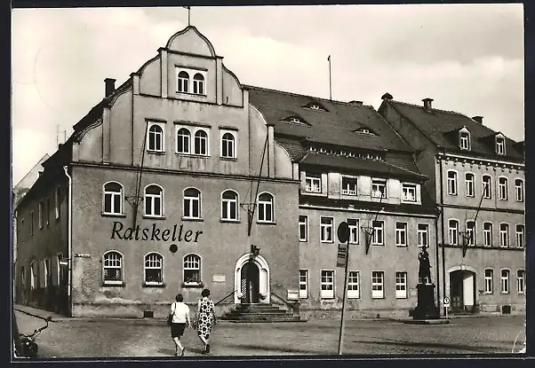 AK Pulsnitz, Rathaus und Gasthaus Ratskeller, Panorama