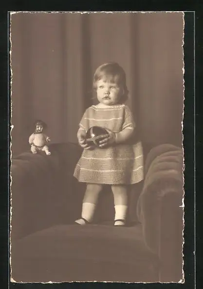 AK Puppe, kleines Mädchen mit ihrer Puppe auf einem Sessel