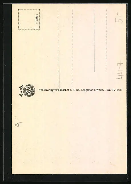 Personenbezogene Daten auf der Rückseite der Karte wurden durch blauen Textmarker unkenntlich gemacht. Die blauen Stellen sind auf die Vorderseite durchgeweicht und wirken sich negativ auf das Postkartenfoto aus