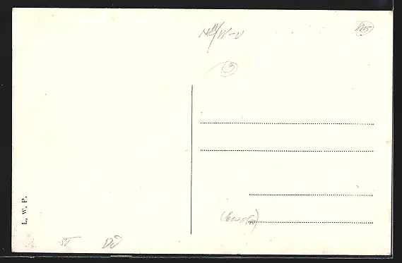 Personenbezogene Daten auf der Rückseite der Karte wurden durch blauen Textmarker unkenntlich gemacht. Die blauen Stellen sind auf die Vorderseite durchgeweicht und wirken sich negativ auf das Postkartenfoto aus