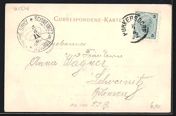 Personenbezogene Daten auf der Rückseite der Karte wurden durch blauen Textmarker unkenntlich gemacht. Die blauen Stellen sind auf die Vorderseite durchgeweicht und wirken sich negativ auf das Postkartenfoto aus