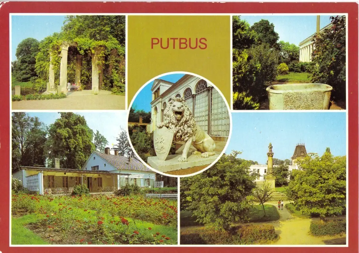 Ansichtskarte Putbus Rügen fünf Abb., gestaltet Pergola im Park, OT Lauterbach - Marmorbadewanne, Rosengarten mit Rosencafé, Löwenstandbild vor der Orangerie, Marktplatz Erhaltung I-II ungelaufen Druckvermerk: 1987 Herstellungsland: DDR Verlag: Bild und Heimat, Reichenbach i. V. - 01 01 0626/12