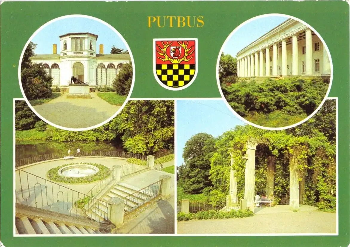 Ansichtskarte Putbus Rügen vier Abb., gestaltet, Wappen Orangerie im Park, OT Lauterbach - Erholungsheim "Haus Goor", Neue Terrasse im Park, Pergola im Park Erhaltung I-II ungelaufen Druckvermerk: 1987 Herstellungsland: DDR Verlag: Bild und Heimat, Reichenbach i. V. - 01 01 0625/12