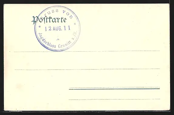 Personenbezogene Daten auf der Rückseite der Karte wurden durch blauen Textmarker unkenntlich gemacht. Die blauen Stellen sind auf die Vorderseite durchgeweicht und wirken sich negativ auf das Postkartenfoto aus