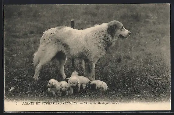 AK Pyrenäenberghund mit Wurf auf einer Wiese