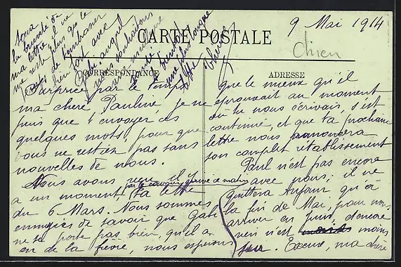 Personenbezogene Daten auf der Rückseite der Karte wurden durch blauen Textmarker unkenntlich gemacht. Die blauen Stellen sind auf die Vorderseite durchgeweicht und wirken sich negativ auf das Postkartenfoto aus