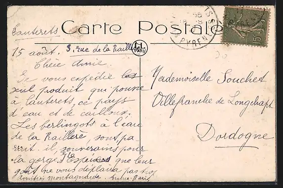 Personenbezogene Daten auf der Rückseite der Karte wurden durch blauen Textmarker unkenntlich gemacht. Die blauen Stellen sind auf die Vorderseite durchgeweicht und wirken sich negativ auf das Postkartenfoto aus