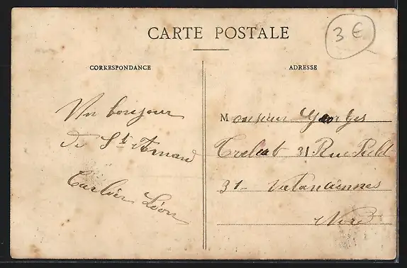 Personenbezogene Daten auf der Rückseite der Karte wurden durch blauen Textmarker unkenntlich gemacht. Die blauen Stellen sind auf die Vorderseite durchgeweicht und wirken sich negativ auf das Postkartenfoto aus