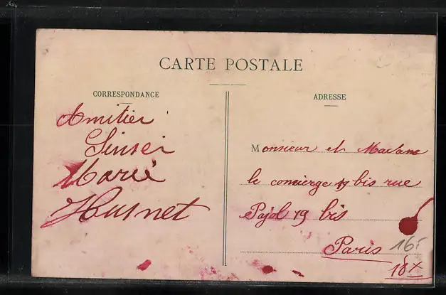 Personenbezogene Daten auf der Rückseite der Karte wurden durch blauen Textmarker unkenntlich gemacht. Die blauen Stellen sind auf die Vorderseite durchgeweicht und wirken sich negativ auf das Postkartenfoto aus