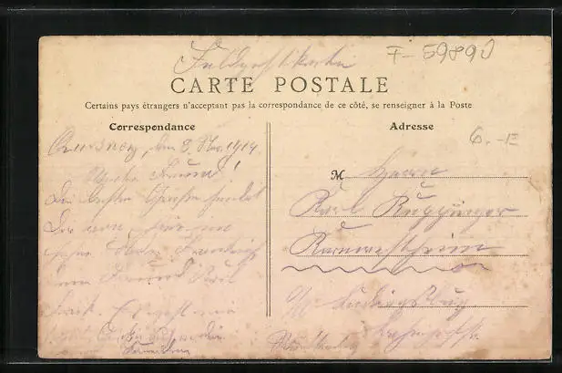 Personenbezogene Daten auf der Rückseite der Karte wurden durch blauen Textmarker unkenntlich gemacht. Die blauen Stellen sind auf die Vorderseite durchgeweicht und wirken sich negativ auf das Postkartenfoto aus