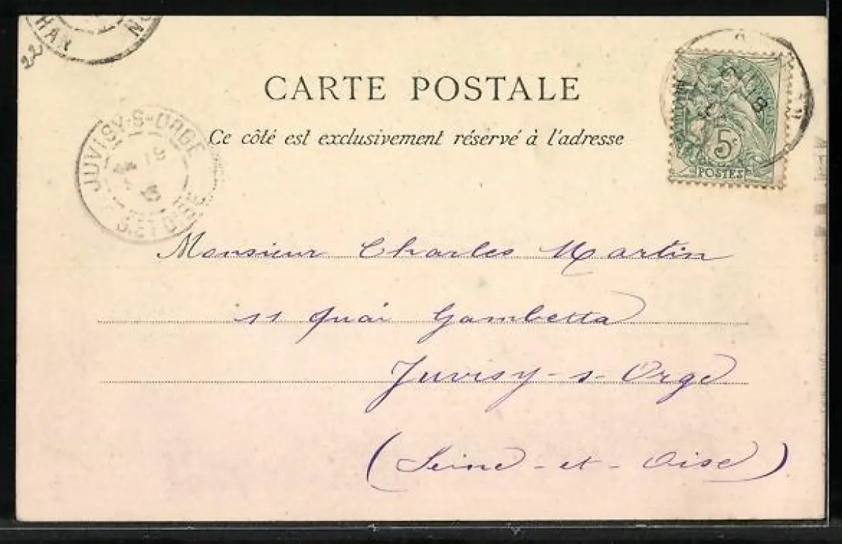Personenbezogene Daten auf der Rückseite der Karte wurden durch blauen Textmarker unkenntlich gemacht. Die blauen Stellen sind auf die Vorderseite durchgeweicht und wirken sich negativ auf das Postkartenfoto aus