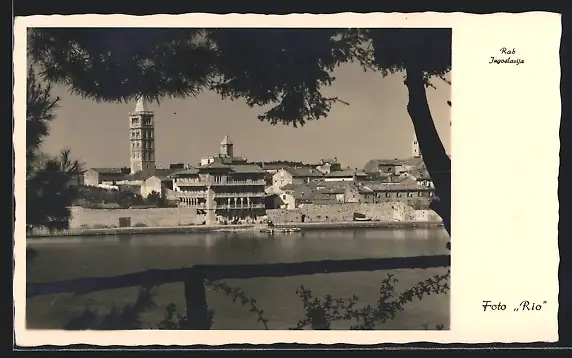 AK Rab, Ortsansicht mit Wasserpartie und Turm