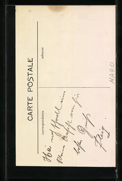 Personenbezogene Daten auf der Rückseite der Karte wurden durch blauen Textmarker unkenntlich gemacht. Die blauen Stellen sind auf die Vorderseite durchgeweicht und wirken sich negativ auf das Postkartenfoto aus