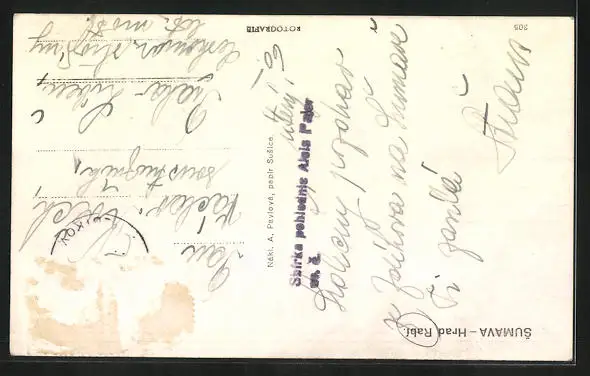 Personenbezogene Daten auf der Rückseite der Karte wurden durch blauen Textmarker unkenntlich gemacht. Die blauen Stellen sind auf die Vorderseite durchgeweicht und wirken sich negativ auf das Postkartenfoto aus