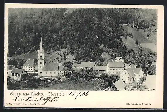 AK Rachau, Teilansicht mit Kirche aus der Vogelschau