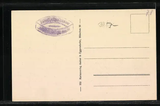 Personenbezogene Daten auf der Rückseite der Karte wurden durch blauen Textmarker unkenntlich gemacht. Die blauen Stellen sind auf die Vorderseite durchgeweicht und wirken sich negativ auf das Postkartenfoto aus