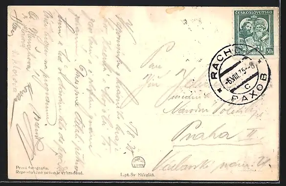 Personenbezogene Daten auf der Rückseite der Karte wurden durch blauen Textmarker unkenntlich gemacht. Die blauen Stellen sind auf die Vorderseite durchgeweicht und wirken sich negativ auf das Postkartenfoto aus