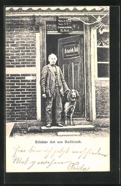 AK Radbruch, Schäfer Ast mit seinem Hund vor der Tür