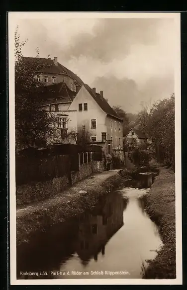 AK Radeberg i. Sa., Röderpartie mit Schloss Klippenstein