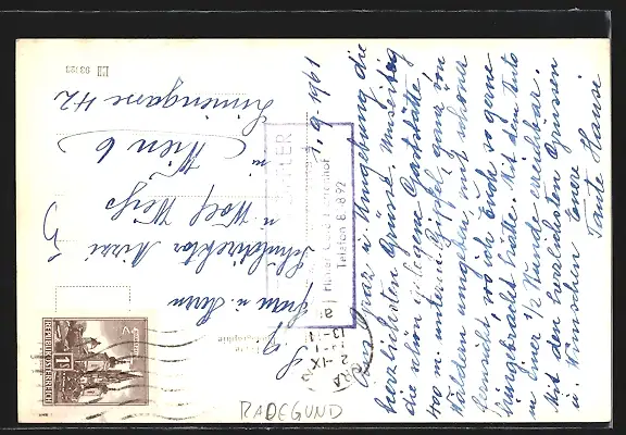 Personenbezogene Daten auf der Rückseite der Karte wurden durch blauen Textmarker unkenntlich gemacht. Die blauen Stellen sind auf die Vorderseite durchgeweicht und wirken sich negativ auf das Postkartenfoto aus