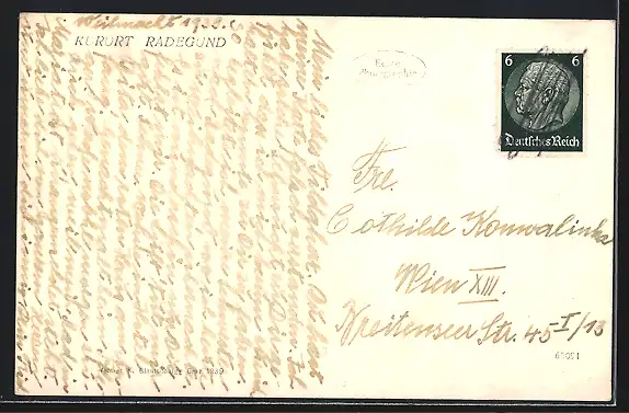 Personenbezogene Daten auf der Rückseite der Karte wurden durch blauen Textmarker unkenntlich gemacht. Die blauen Stellen sind auf die Vorderseite durchgeweicht und wirken sich negativ auf das Postkartenfoto aus