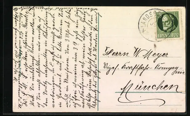 Personenbezogene Daten auf der Rückseite der Karte wurden durch blauen Textmarker unkenntlich gemacht. Die blauen Stellen sind auf die Vorderseite durchgeweicht und wirken sich negativ auf das Postkartenfoto aus