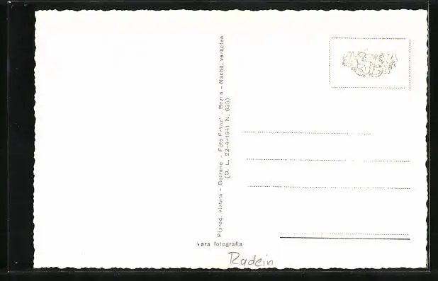Personenbezogene Daten auf der Rückseite der Karte wurden durch blauen Textmarker unkenntlich gemacht. Die blauen Stellen sind auf die Vorderseite durchgeweicht und wirken sich negativ auf das Postkartenfoto aus