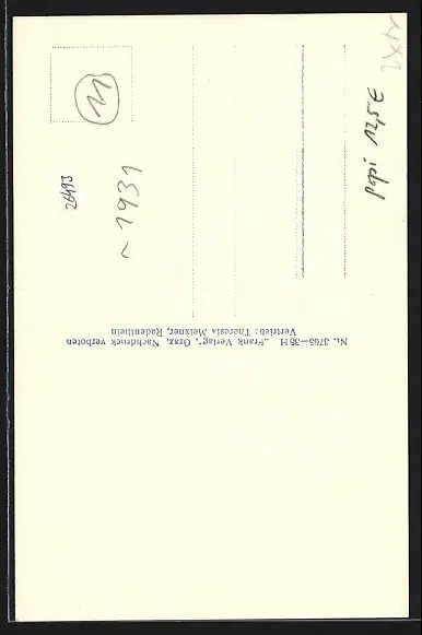 Personenbezogene Daten auf der Rückseite der Karte wurden durch blauen Textmarker unkenntlich gemacht. Die blauen Stellen sind auf die Vorderseite durchgeweicht und wirken sich negativ auf das Postkartenfoto aus