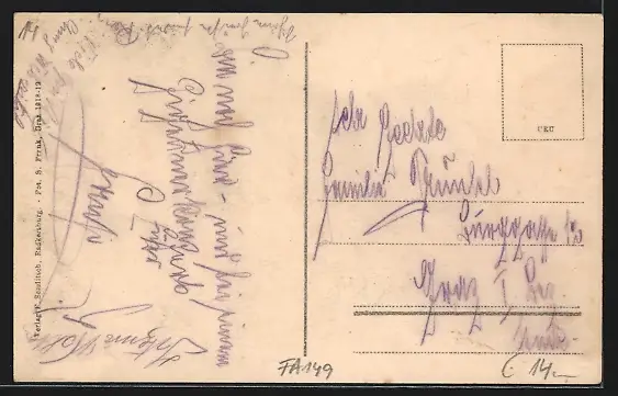 Personenbezogene Daten auf der Rückseite der Karte wurden durch blauen Textmarker unkenntlich gemacht. Die blauen Stellen sind auf die Vorderseite durchgeweicht und wirken sich negativ auf das Postkartenfoto aus