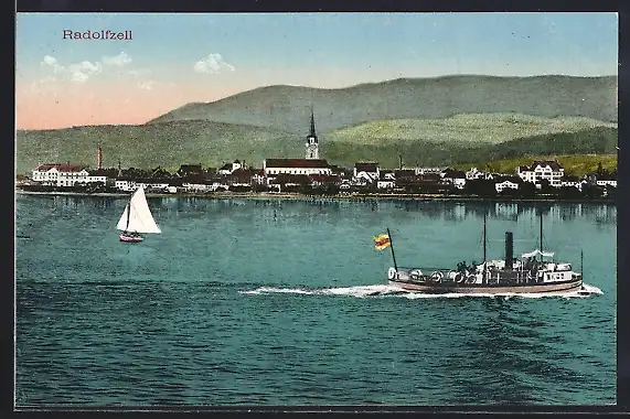 AK Radolfzell, Uferpartie mit Kirche und Dampfer