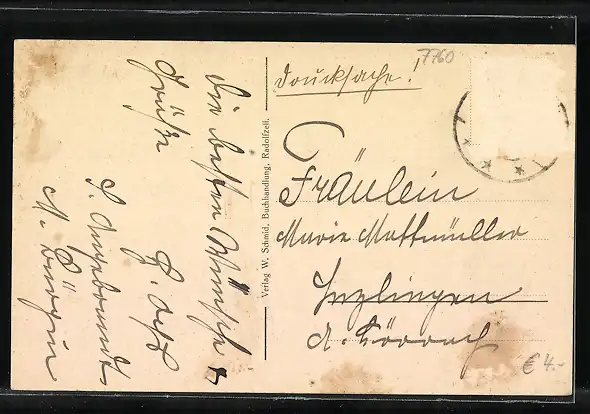 Personenbezogene Daten auf der Rückseite der Karte wurden durch blauen Textmarker unkenntlich gemacht. Die blauen Stellen sind auf die Vorderseite durchgeweicht und wirken sich negativ auf das Postkartenfoto aus