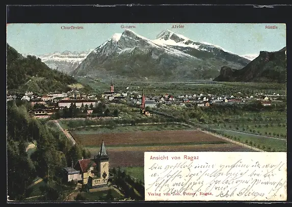 AK Ragaz, Ortsansicht mit Churfirsten, Gonzen, Alvier und Säntis