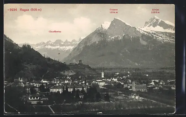 AK Ragaz, Ortsansicht mit Churfirsten und Gonzem