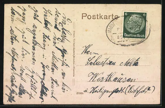 Personenbezogene Daten auf der Rückseite der Karte wurden durch blauen Textmarker unkenntlich gemacht. Die blauen Stellen sind auf die Vorderseite durchgeweicht und wirken sich negativ auf das Postkartenfoto aus