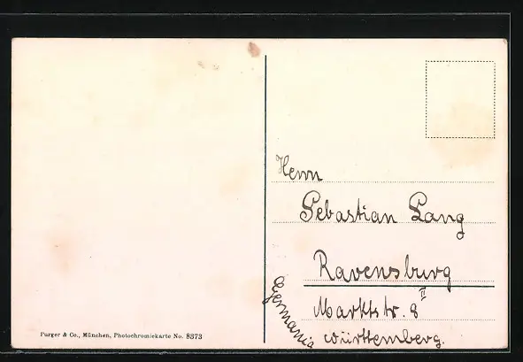 Personenbezogene Daten auf der Rückseite der Karte wurden durch blauen Textmarker unkenntlich gemacht. Die blauen Stellen sind auf die Vorderseite durchgeweicht und wirken sich negativ auf das Postkartenfoto aus