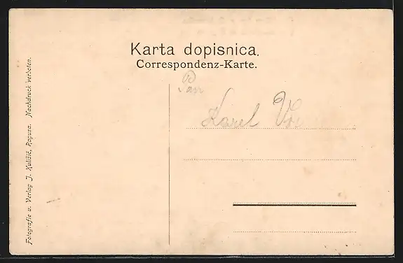 Personenbezogene Daten auf der Rückseite der Karte wurden durch blauen Textmarker unkenntlich gemacht. Die blauen Stellen sind auf die Vorderseite durchgeweicht und wirken sich negativ auf das Postkartenfoto aus