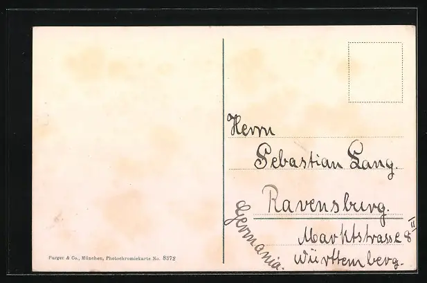 Personenbezogene Daten auf der Rückseite der Karte wurden durch blauen Textmarker unkenntlich gemacht. Die blauen Stellen sind auf die Vorderseite durchgeweicht und wirken sich negativ auf das Postkartenfoto aus